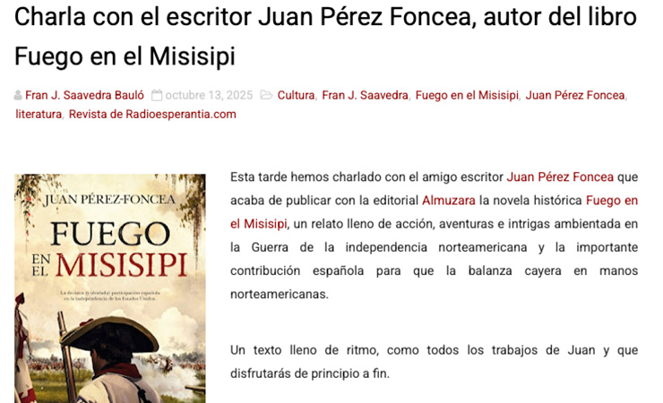 Fran J. Saavedra charla con Juan Pérez Foncea, sobre Fuego en el Misisipi en radioesperantia.com el 13/10/2025. Puedes escucharla en este mismo enlace